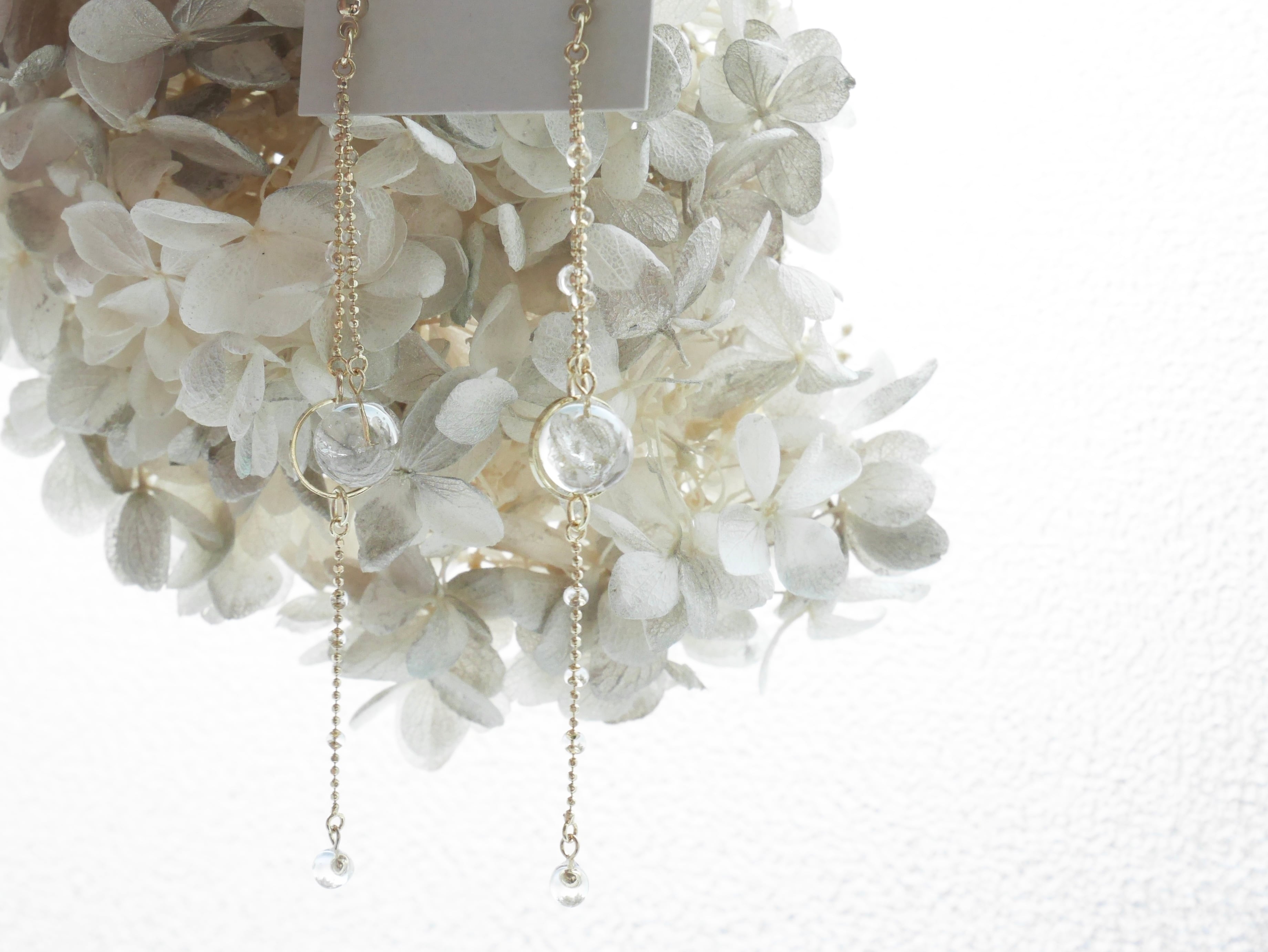 『朝露』 コロコロとした透明感たっぷりの朝露シリーズ。葉っぱや花に滴る雫、映り込む色、小さな逆さまの風景を思い出しながらできた作品。 雨上がりに散歩していて出会う、朝露に映り込む沢山の世界。ついつい覗き込んでしまうし触ってぽとんと落としてしまう。あの雫がそのまま形に残ったら良いのになと思った思い出。 大きめ球体サイズですが樹脂なので軽いつけ心地です。 球体サイズ:約1.5㎝ 重さ:3.5g 素材:レジン、プリザーブドフラワー ピアス金具:サージカルステンレス カラー:グリーン紫陽花 ※着用画像は商品とは別カラーです。着用感の参考としてご覧ください。 【ご購入前にお読みください】 ※アクセサリー金属パーツは、手汗等の汚れにより酸化し変色する場合があります。 使用後は軽く拭くなどお手入れをし、日の当たらない場所での保管をお願いいたします。 ※写真と実際の商品は色味が若干異なる場合がございます。